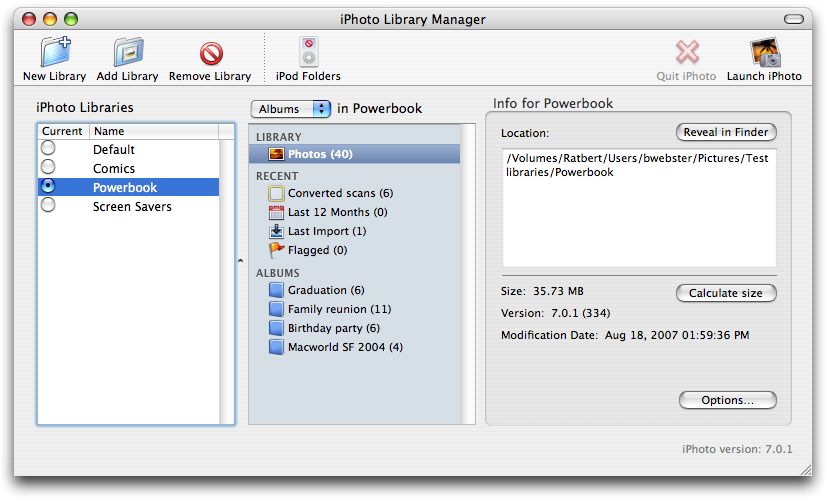 - Size: the total size of the library. Note that this value can be different than the size for your library that is displayed within iPhoto itself, because this calculation takes into account all the other files in the library folder, not just the photos themselves. If you choose to store some photos outside the library folder, the size of those photos will not be included. Click the "Calculate size" button to perform the calculation, or you can use the preferences to have iPhoto Library Manager calculate this size automatically.