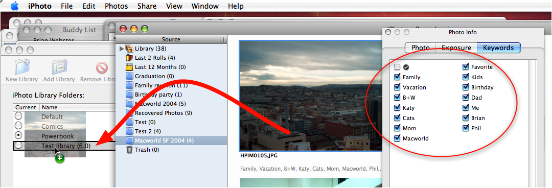 - Assign every keyword in the library to the dummy photo (or at least every keyword you want to bring over to the other library). Note that doing this through the keyword pane in the lower left is a big pain in the butt, since you have to draaaaag the photo on to each keyword over and over again. Try using the info window (command-i) which has simple checkboxes, much better for quickly assigning multiple keywords to a photo.