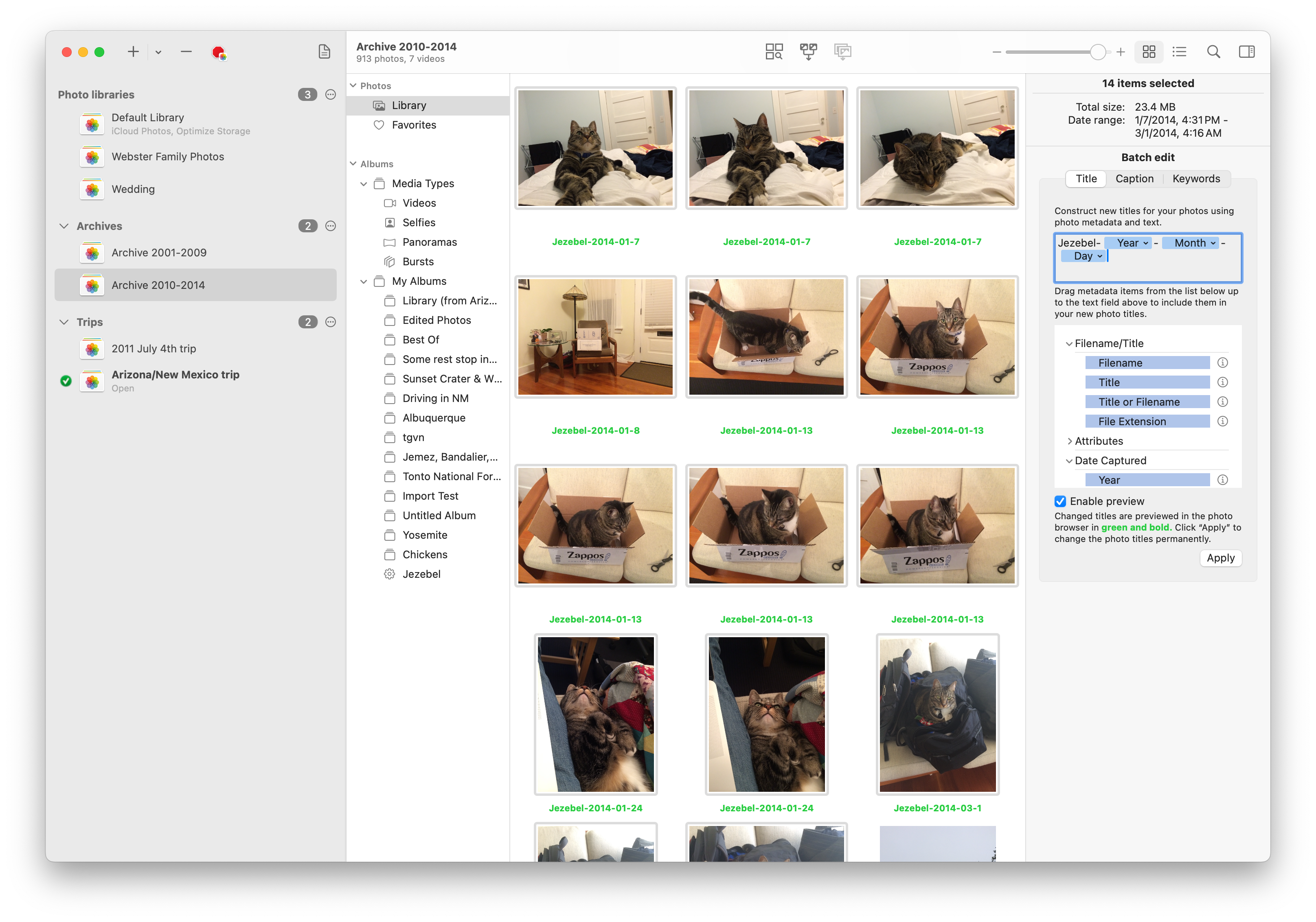 In this setup, we are giving every photo the title “Jezebel” followed by the year, month, and day that the photo was taken. So for example, for a photo taken on January 7th, 2014, the title would be “Jezebel-2014-01-07”. If the next photo was taken January 8th, 2014, then that photo will get the title “Jezebel-2014-01-08”, and so forth.