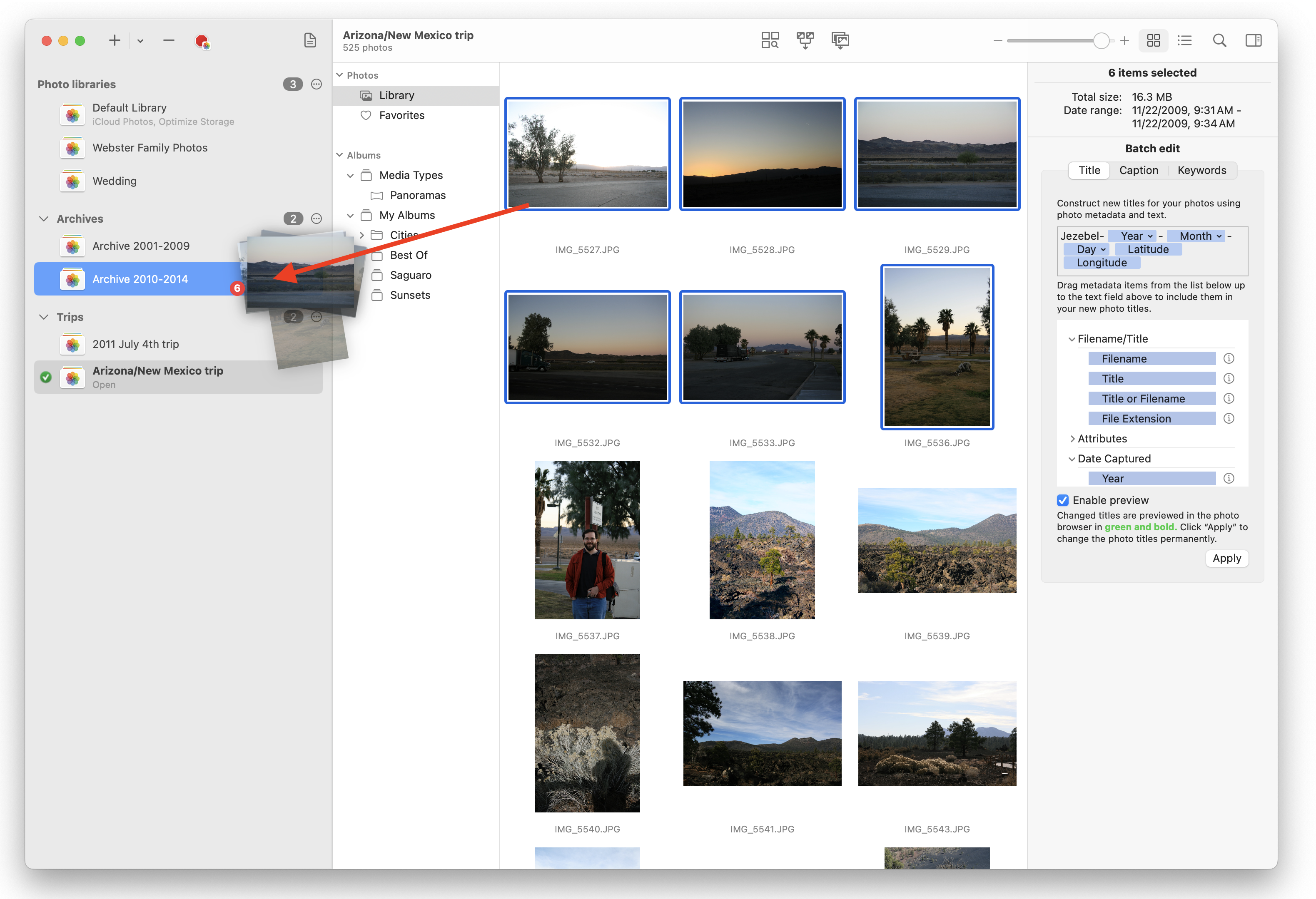 To ensure that the extra photo information such as edits, titles, descriptions, keywords, dates, and favorites will come over, you should drag the photos from PowerPhotos’ image browser, and not from a Finder window, the Photos app window, or some other program that lets you drag files. If you drag from somewhere else, they will be treated as regular photos, and the extra information associated with them from Photos will not be brought into the destination library.