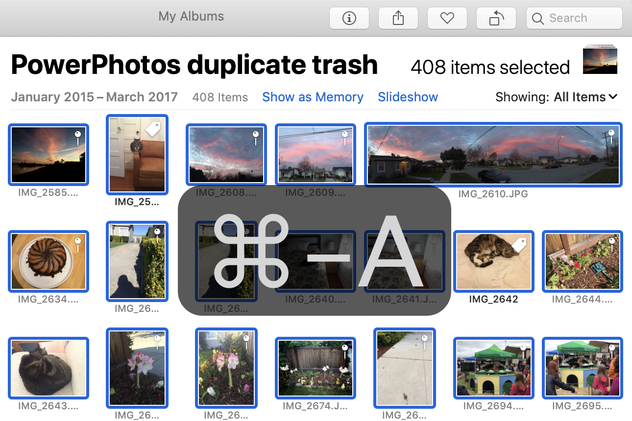 2.Select All Photos Select all the photos in the “PowerPhotos duplicate trash” album, either by pressing command-a or choosing “Select All” from the Edit menu.