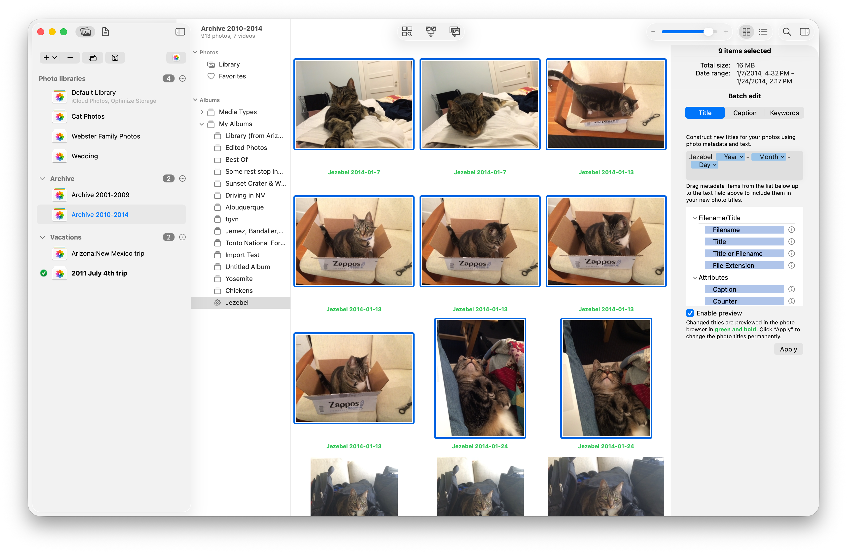 In addition to editing photo metadata one at a time, PowerPhotos allows you to select an entire batch of photos and apply titles, keywords, or captions to all the selected photos at the same time.