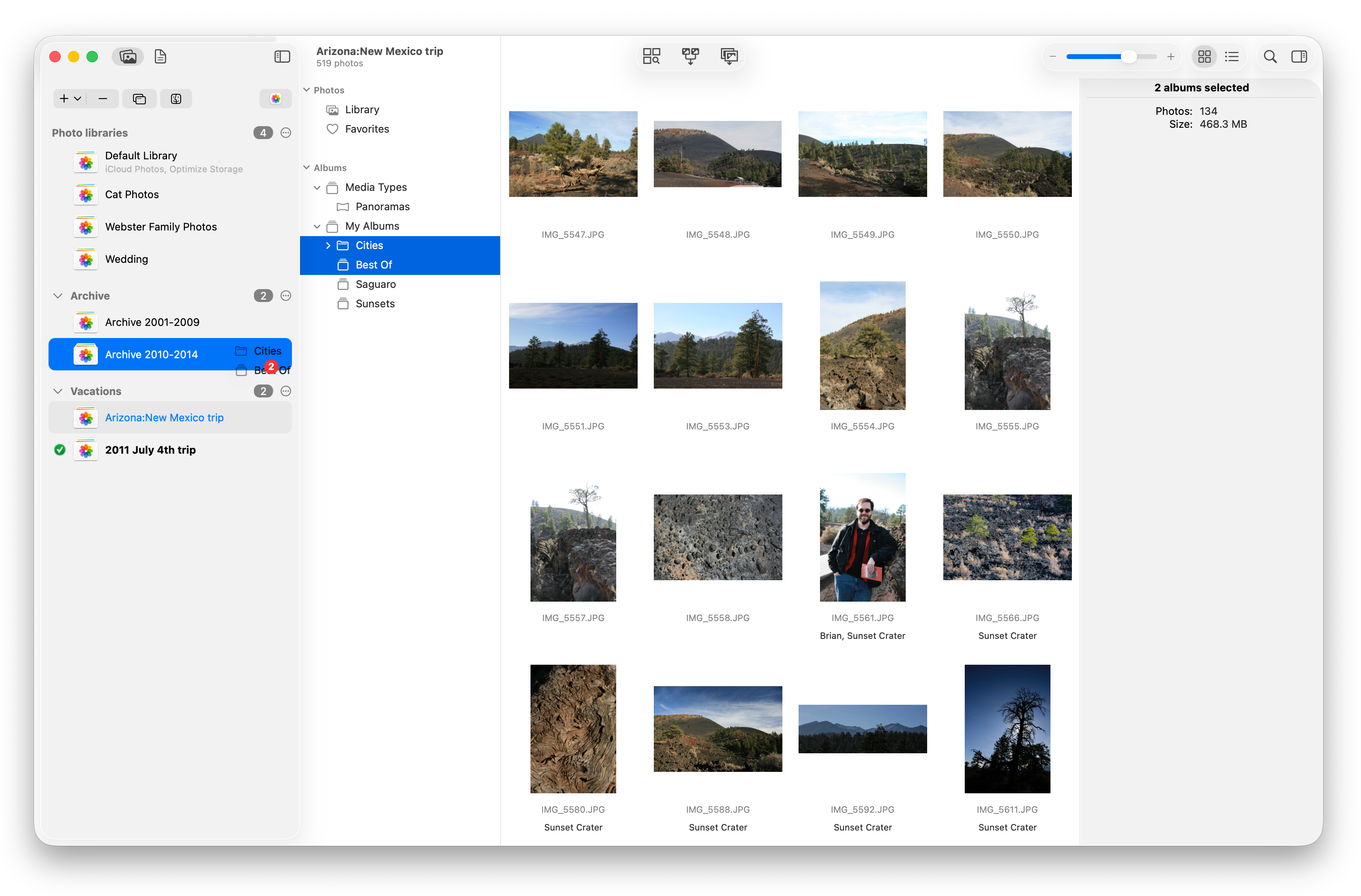 When keeping your photos separated in multiple libraries, you sometimes need to copy a set of photos from one library to another. With Photos, the only way to do this is to manually export the photos from one library, switch over to your other library, and then manually import them into that library. PowerPhotos provides a way to copy photos directly from one library to another in one step, while retaining photo metadata such as keywords, dates, favorites, titles, and descriptions.