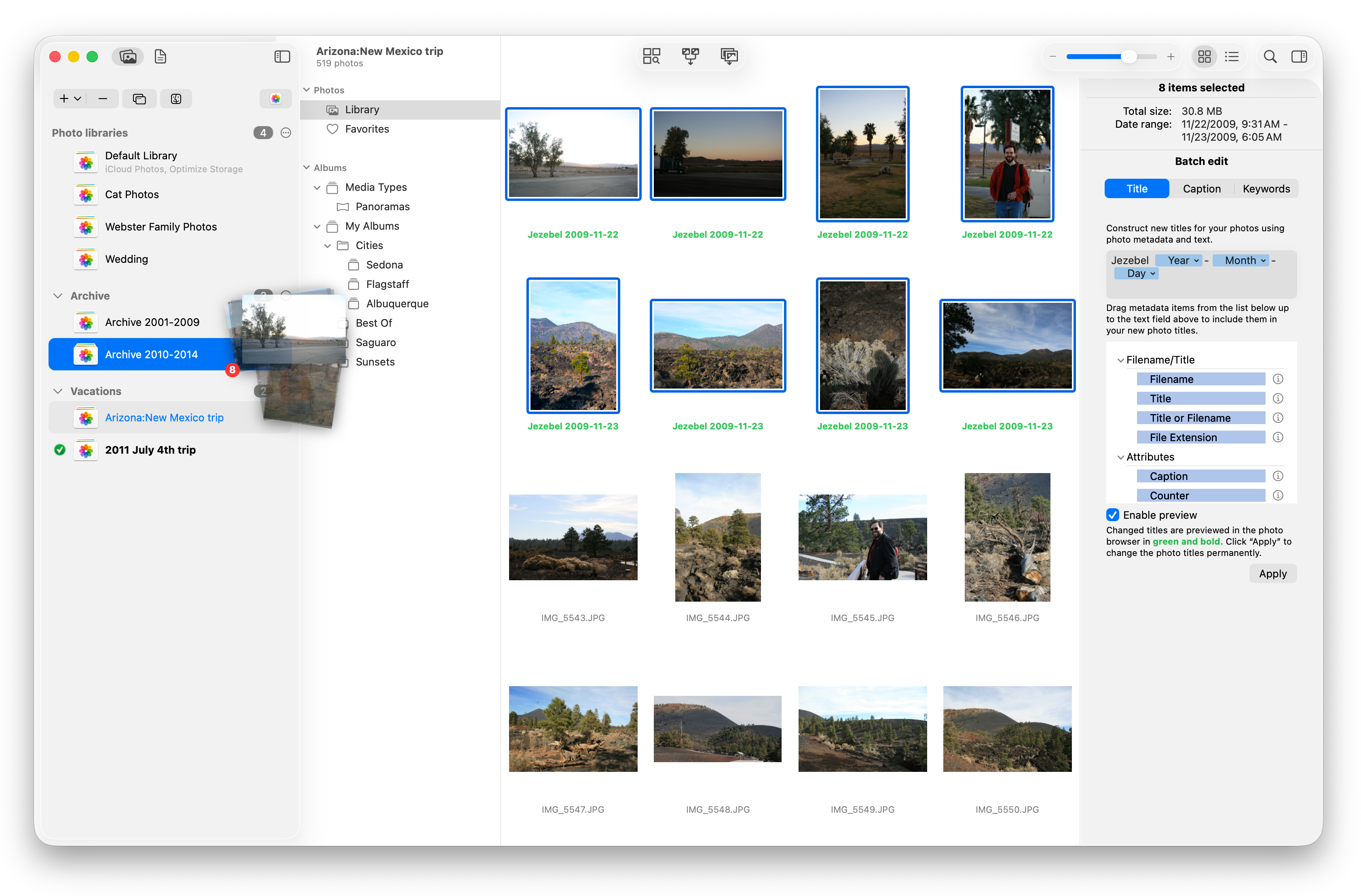 To ensure that the extra photo information such as edits, titles, descriptions, keywords, dates, and favorites will come over, you should drag the photos from PowerPhotos’ image browser, and not from a Finder window, the Photos app window, or some other program that lets you drag files. If you drag from somewhere else, they will be treated as regular photos, and the extra information associated with them from Photos will not be brought into the destination library.