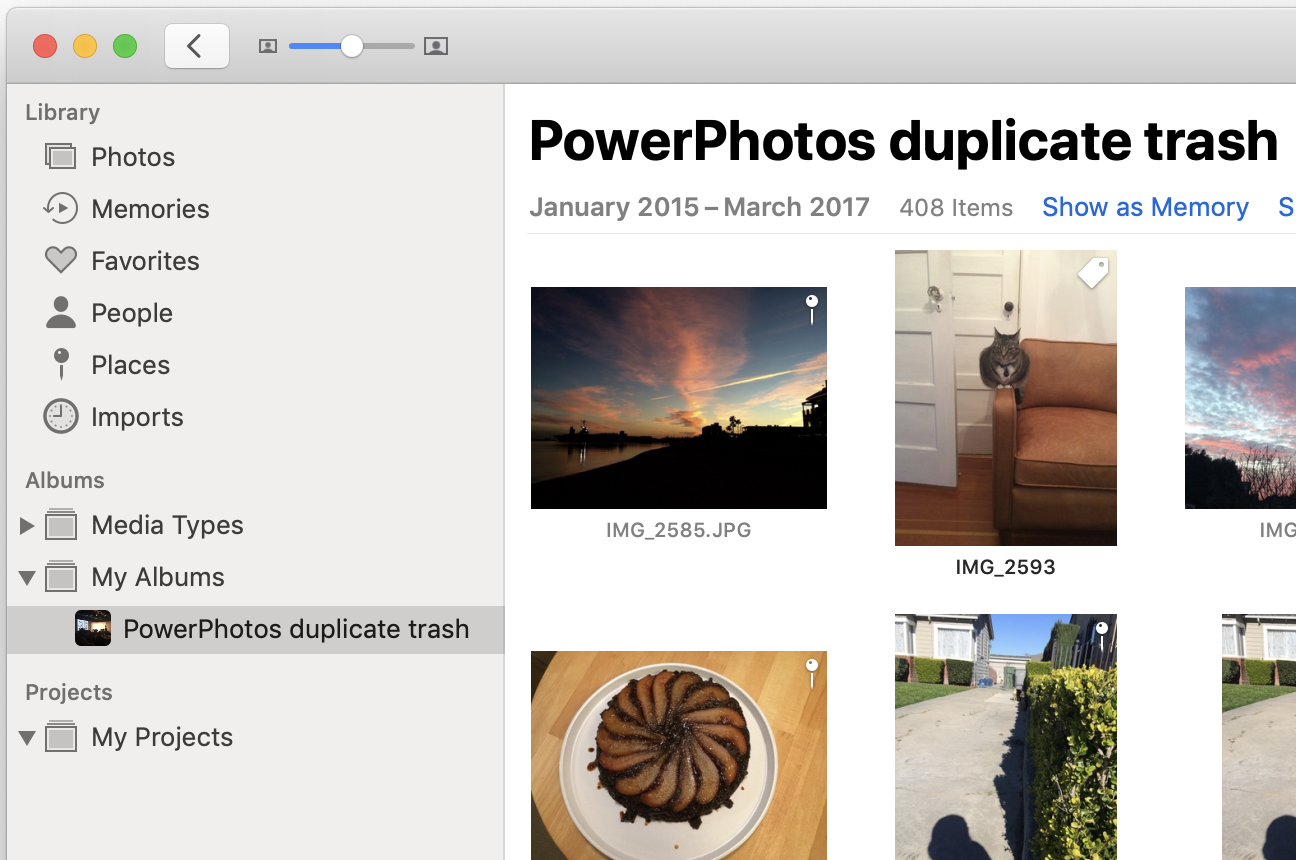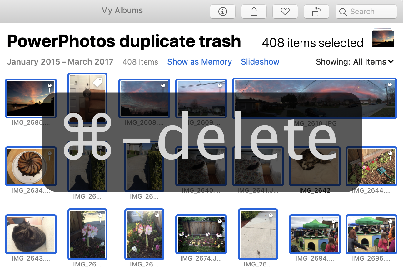 2.Select All Photos Select all the photos in the “PowerPhotos duplicate trash” album, either by pressing command-a or choosing “Select All” from the Edit menu.