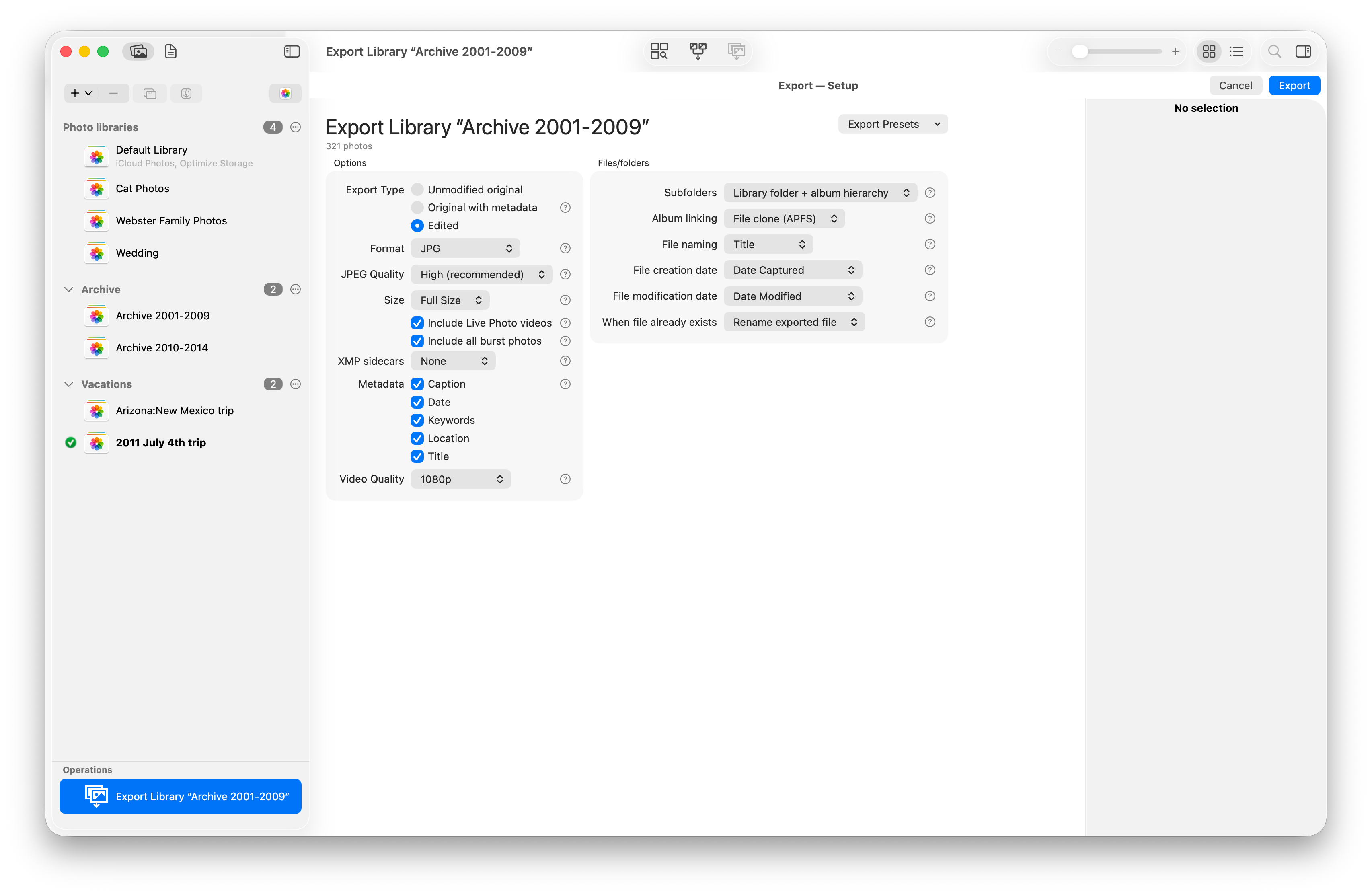 - Whole library: You can select a library in the library list and choose to export the entire library at once. This will export every photo and video in the library, and give you the option to also recreate the library’s album hierarchy, the same way as when exporting individual albums.