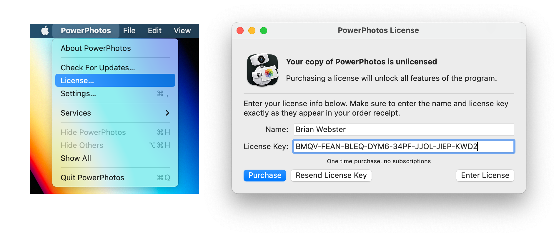 Note: past versions of PowerPhotos have used the terms “registration code” or “serial number” but was later changed “license key”. There is no functional change between the two, just a terminology change.