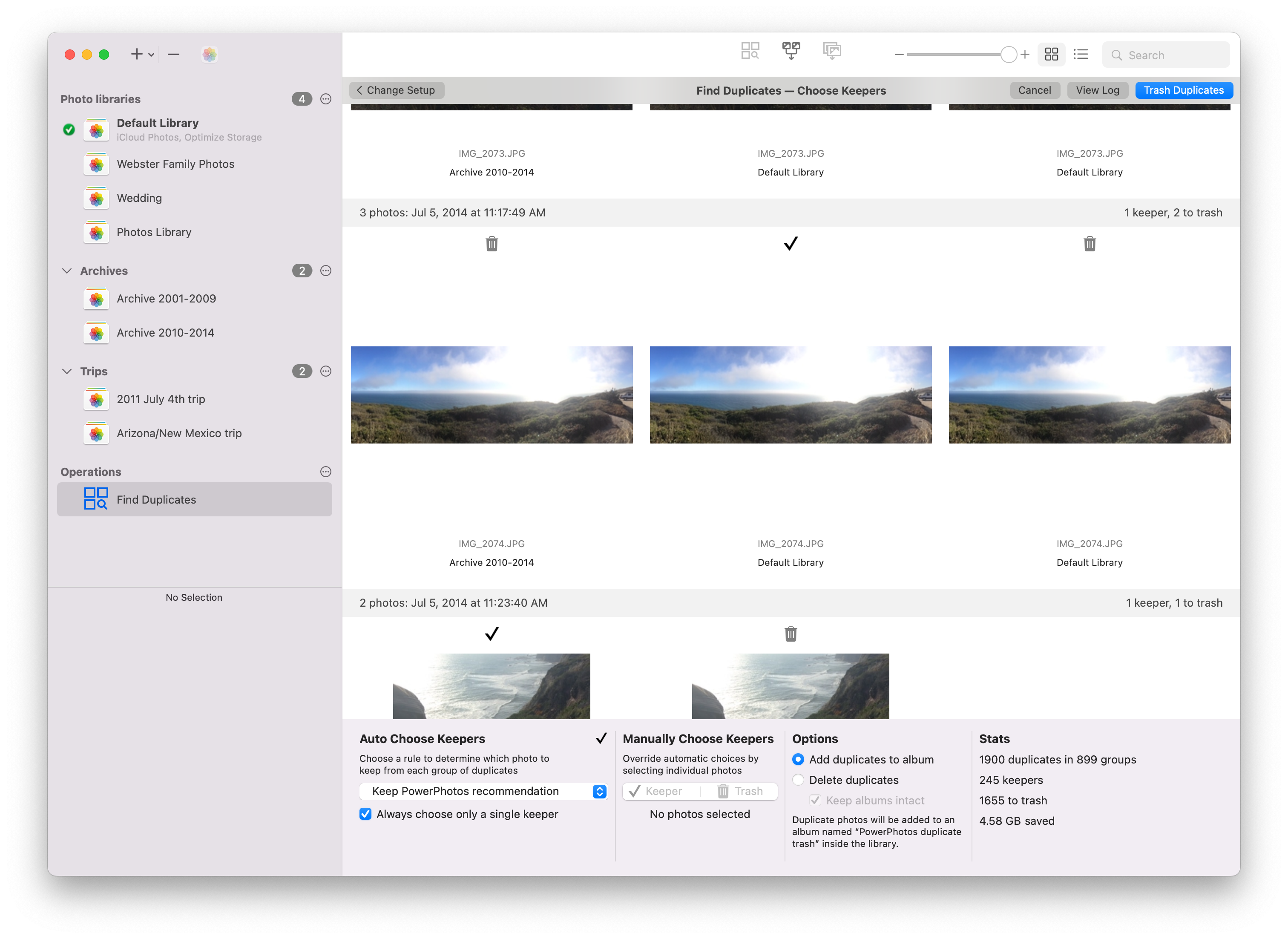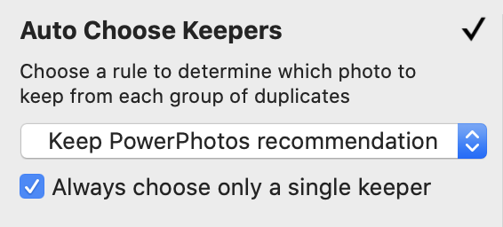 Keeper After finishing a duplicate search, PowerPhotos displays all the duplicates it has found in a number of duplicate groups. Each group of duplicates has one photo marked as the “keeper”, with the rest marked as to be “trashed”. You can use duplicate rules and manual changes to adjust which photos you want to be marked as the keepers.