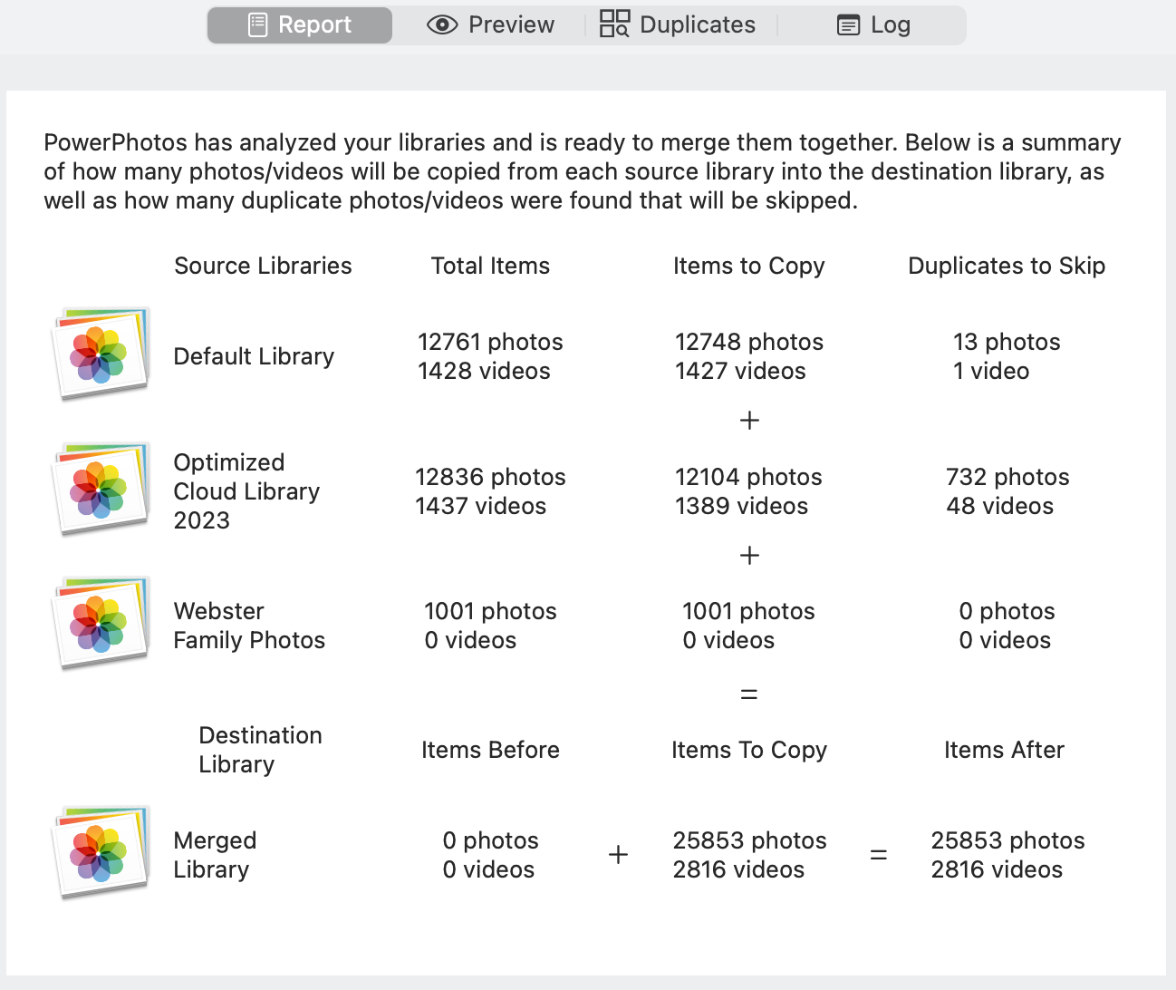 Merging Merging libraries is a feature provide by PowerPhotos that lets you combine the contents of multiple libraries into one. During a merge, the contents of one or more existing libraries will be copied into another library, including all photos and albums, with duplicate photos being skipped. Not to be confused with Migrating.