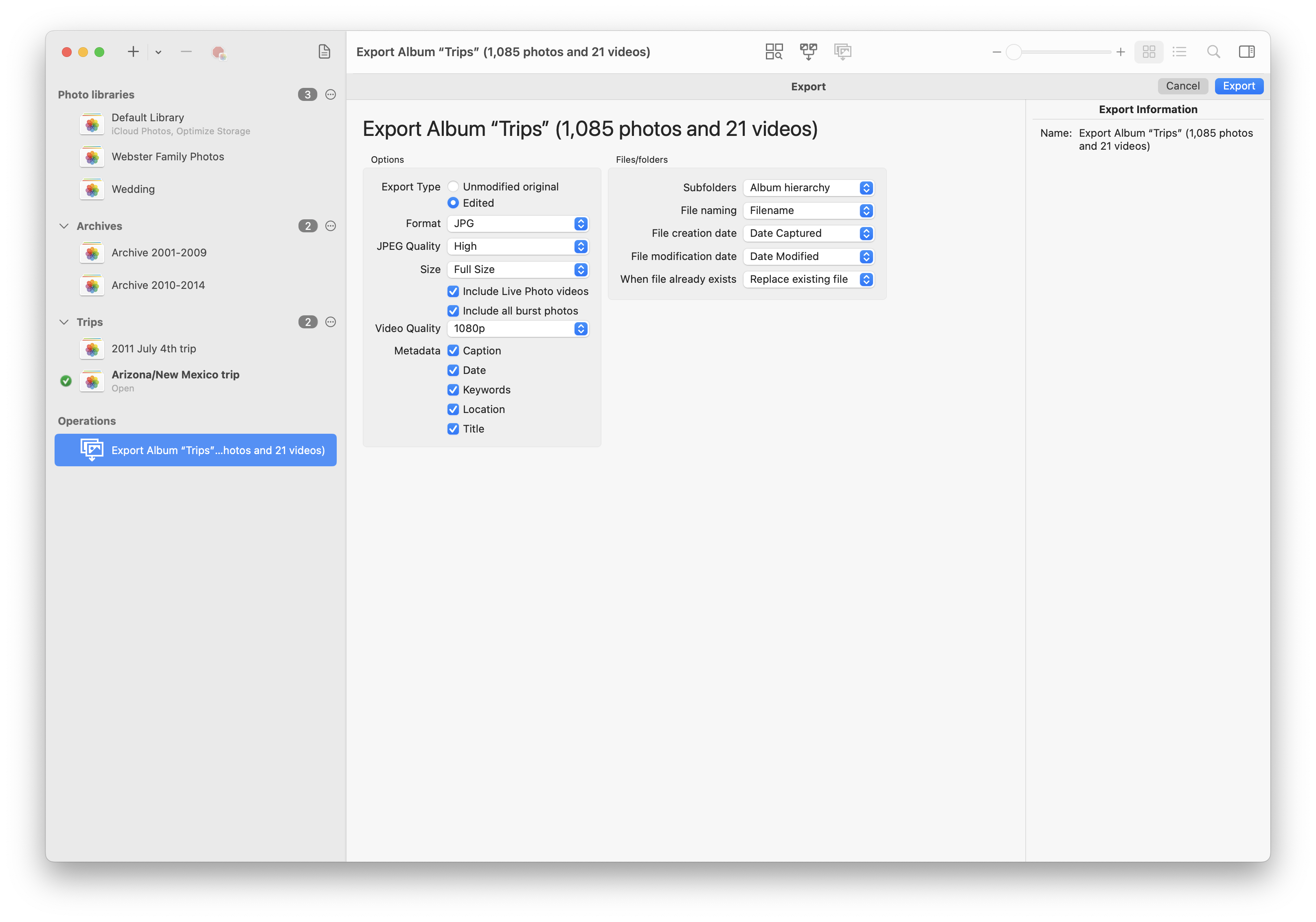 Export Exporting refers to copying photos from a Photos library to a plain folder outside of Photos. Photos has a built-in export command, but PowerPhotos provide one of its own that offers several additional options above what Photos offers.