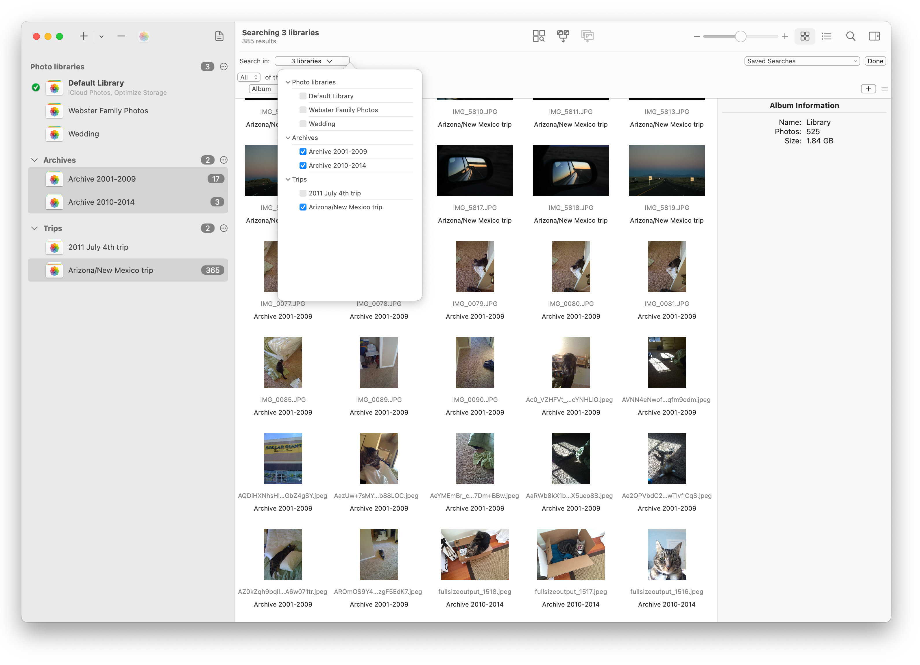 Normally, when using Photos on your Mac, you have a single Photos library that holds all of your photos. As your library grows over time, it can become hard to manage, and Photos can get slower due to the large number of photos in the library. PowerPhotos lets you instead divide your photo collection among multiple Photos libraries. This allows for more fine grained organization, as well as improving the performance of Photos when browsing and editing. If you sync your photos with iCloud Photos, creating separate libraries lets you keep a smaller selection synced with iCloud, while still keeping the bulk of your photos on your Mac. You can also easily browse and search your photos and find duplicate photos in your libraries.