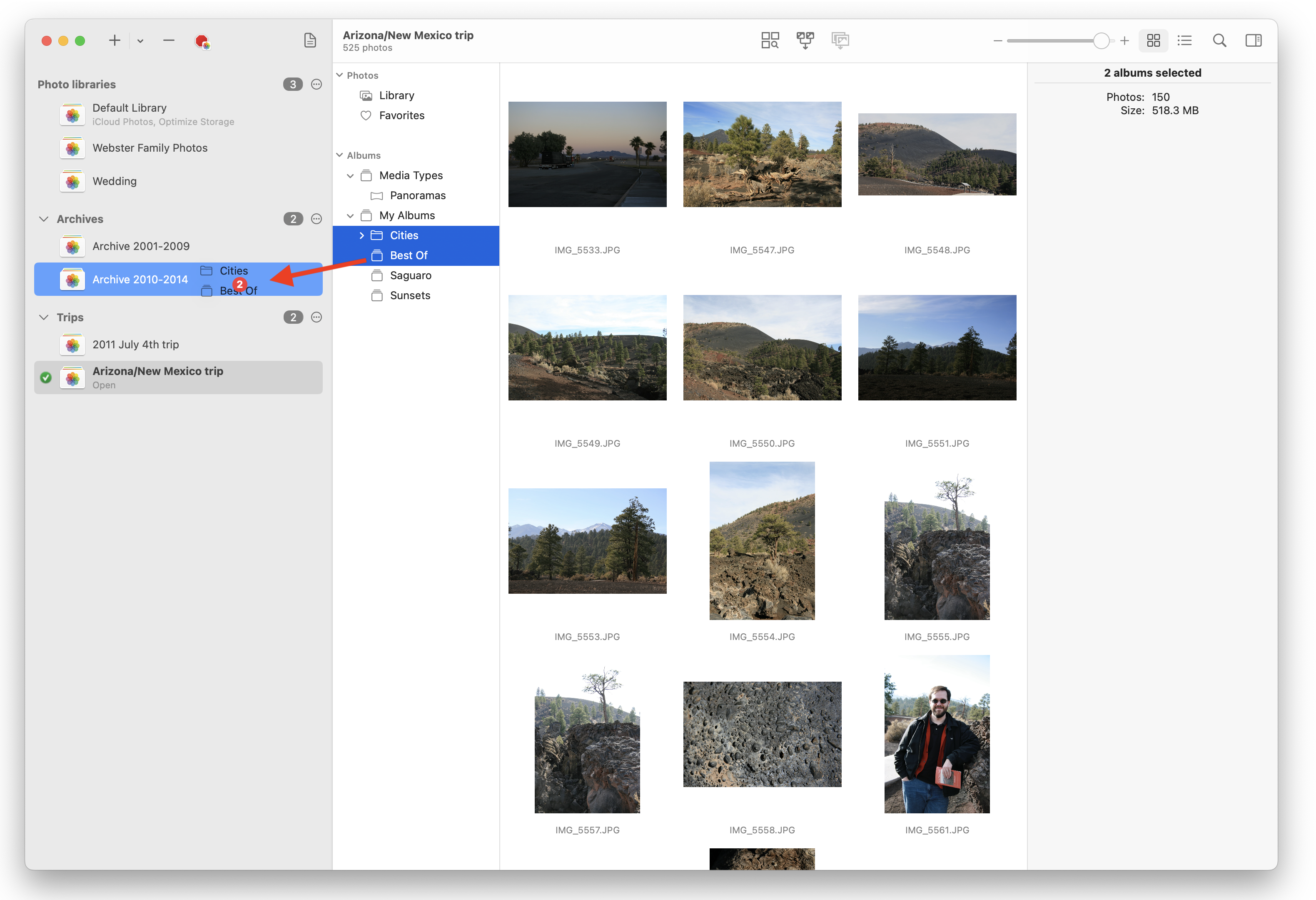 Note that you cannot drag albums from Photos itself into PowerPhotos - you must drag the albums from PowerPhotos’ own window in order to perform a copy. Also, only regular albums and folders can be copied as-is between libraries. Copying a smart album to another library will copy all the photos in that smart album, but a regular album will be created in the destination library containing those photos rather than a smart album. Copying “project” items like calendars, books, and slideshows between libraries is not supported.