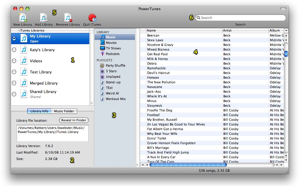 - The library list. This table displays all the libraries that you have in PowerTunes. The library that is currently being used by iTunes will have the radio button next to it selected, and its name printed in bold type.